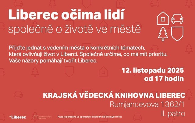 Trápí Vás situace ve městě? Máte nějaké stížnosti, postřehy, ale i nápady, jak vylepšit život v Libereci?přijďte na setkání obyvatel s vedením města, kde máte možnost společně diskutovat o tématech, která ovlivňují každodenní život v Liberci, a určit priority pro zlepšení života ve městě.