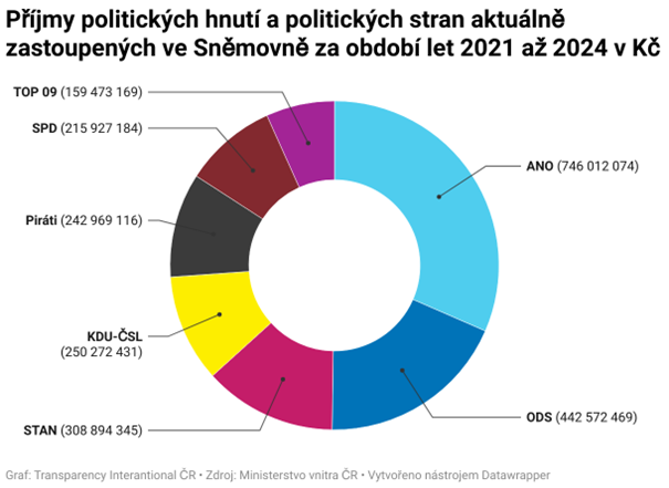 Politická hnutí a politické strany aktuálně zastoupené ve Sněmovně získaly za období let 2021 až 2024 z veřejného rozpočtu celkem 2 366 120 787 korun, jak vyplývá z dat Ministerstva vnitra. Nevládní protikorupční organizace Transparency International ČR (TI) v rámci projektu transparentnivolby.cz přináší analýzu těchto příjmů u vládních subjektů: ODS, KDU-ČSL, TOP 09, STAN a opozičních: ANO, Piráti, SPD.