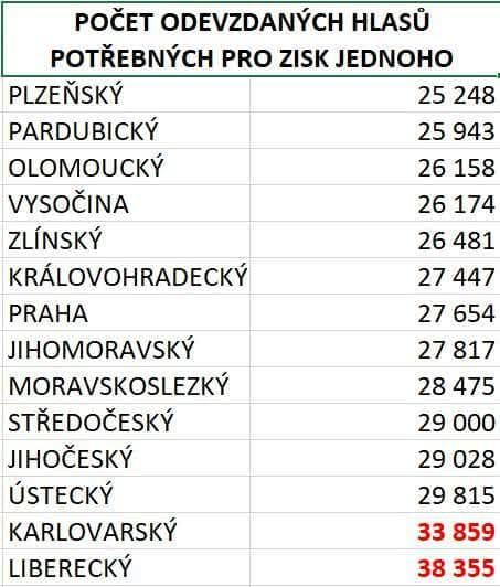 „Tady máme důsledek „Krajozrady“ někdejšími poslanci Janou Pastuchovou (ANO), Tomášem Martínkem (Piráti) a Radovanem Víchem (SPD), když se měnil volební zákon. A důsledkem je – hlas voličů v Libereckém kraji má i 1/4 menší váhu. A taky máme jako kraj o 25% méně poslanců, než by nám spravedlivě podle počtu obyvatel a voličů náleželo,“ uvedl Lukáš Pleticha a svoje argumenty dokládá toto tabulkou: