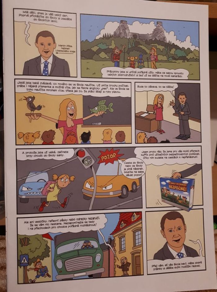 Vedle komerční reklamy je ovšem nejkřiklavější komiks, který celou výbavu kufříku pro prvňáčky doprovází. Jeho hlavní postavou je hodný hejtman Libereckého kraje Martin Půta, který prvňáčky vítá ve škole, říká jim, co a o čem se budou učit a jaké nebezpečí je čekají cestou do školy a v silničním provozu.