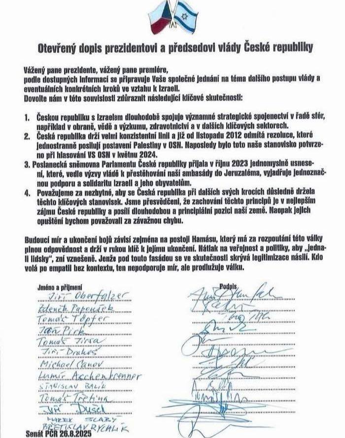 Pod otevřeným dopisem je podepsaná skupina třinácti senátorů, mezi nimi je i liberecký senátor Michael Canov (STAN/Starostové pro Liberecký kraj), ale například i Tomáš Töpfer (ODS) či Břetislav Rychlík (TOP 09 s podporou Pirártů a Zelených). Dopis reaguje na očekávané jednání prezidenta Petra Pavla s premiérem Petrem Fialou (ODS) o situaci na Blízkém východě.
